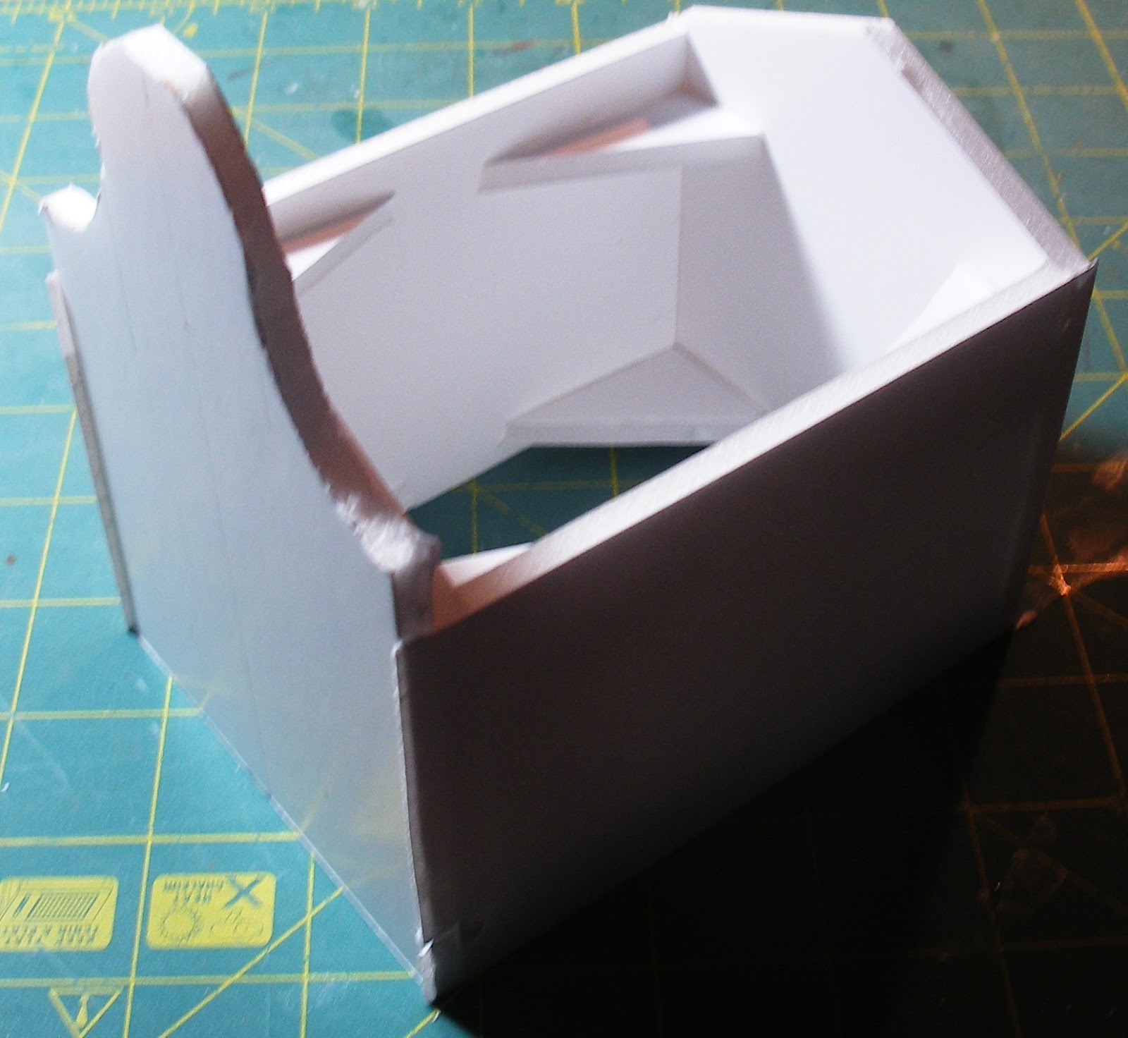 I needed a house which was a little grander than the others in my small Cuban settlement; I wanted something that would pass as the planation owner's residence. I made the basic structure from foamboard and went for the simplest house shape that you could imagine. The technique for making nice neat joints at the corners is described in my description of building a Spanish Colonial Church here on my blog.  I have also included strengthening braces at the corners as you can see here: